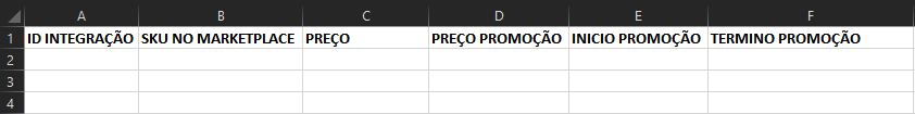 - A planilha contém as seguintes colunas: ID Integração, SKU no Marketplace, Preço, Preço Promoção, inicio promoção e Termino Promoção. Para a alteração de preços, é obrigatório preencher os campos ID Integração, SKU no Marketplace e Preço. Os dados de promoção são opcionais. Após preencher as informações necessárias, salve a planilha e importe o arquivo em "+ Adicionar Arquivo para Upload..."