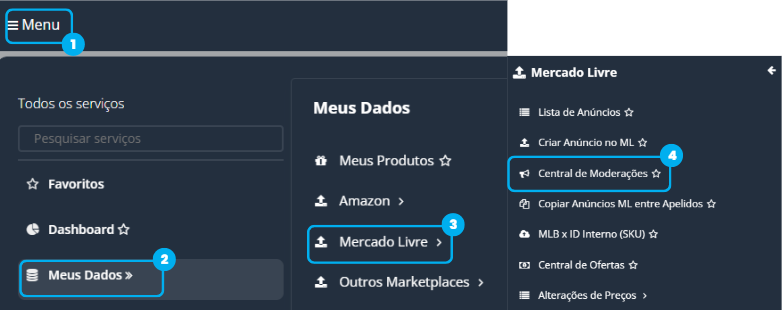 Menu > Meus dados > Mercado Livre > Central de Moderações