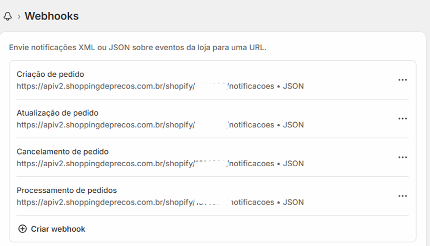 É necessário criar Webhooks na Shopify para que o "Shopping de Preços" receba notificações em tempo real sobre eventos de pedidos (criado, atualizado, cancelado).
