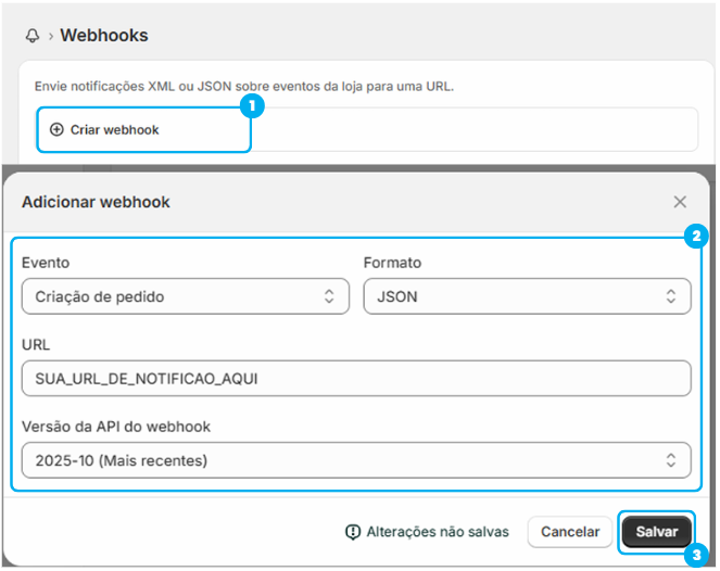 IMPORTANTE: Deverá preencher e salvar um webhooks para cada um dos quatro eventos de pedido listados. Isso significa que você criará um total de quatro Webhooks separados, todos utilizando a mesma URL de Notificações.