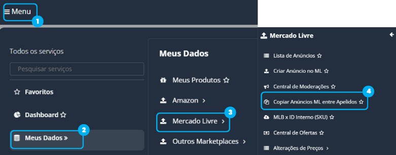 Menu > Meus Dados > Mercado Livre > Copiar anúncios ML entre apelidos
