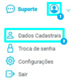 No canto superior direito, clique no ícone do usuário e clique em "Dados Cadastrais".