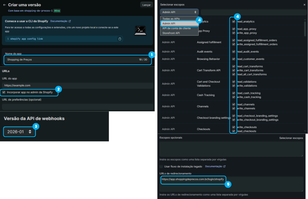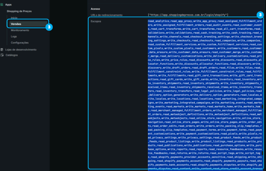 - URLs de redirecionamento: Insira exatamente este endereço: https://app.shoppingdeprecos.com.br/login/shopify