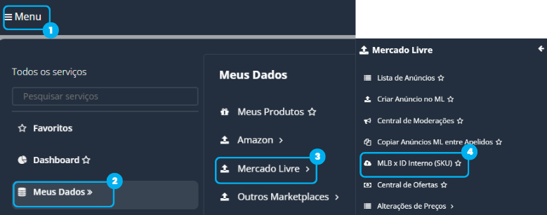 Menu > Meus Dados > Mercado Livre > MLB x ID Interno (SKU)