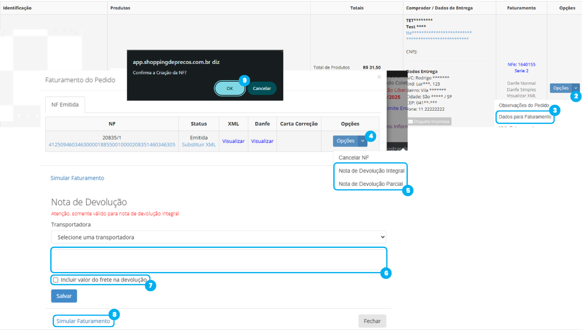 - Caso seja necessário incluir o valor do frete na devolução, marque a opção correspondente.