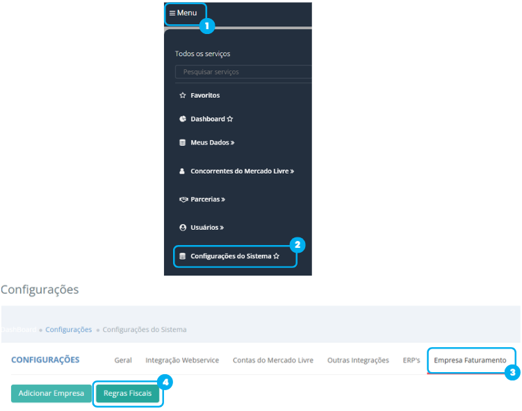 Acesse Menu > Configurações do Sistema > Empresa de Faturamento > Regras Fiscais