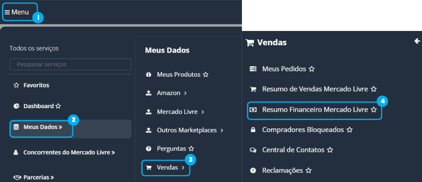 Menu > Meus Dados > Vendas > Resumo Financeiro Mercado Livre