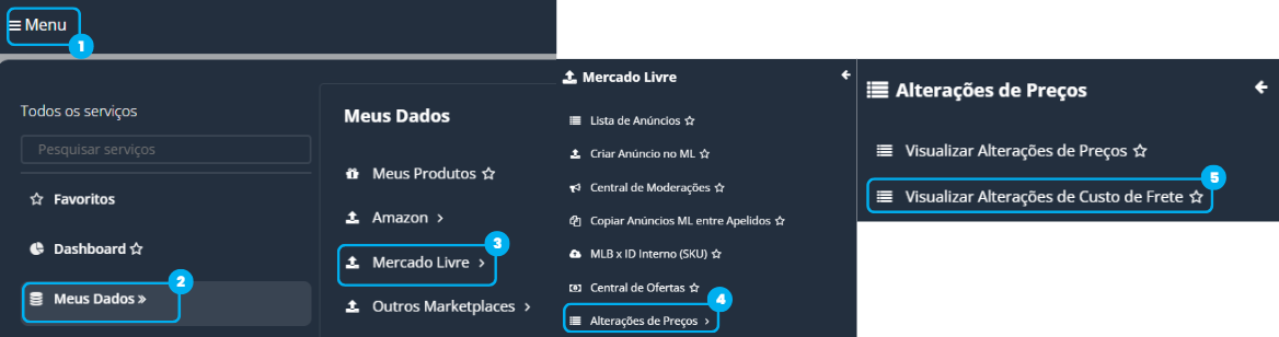 Menu > Meus dados > Mercado Livre > Alterações de Preços > Visualizar alterações de Custo de frete